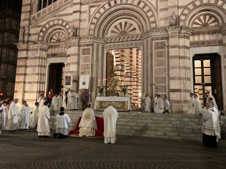 ha offerto al Vescovo lo spunto per riflettere sul fatto che, celebrare questa festa significhi «andare al centro della nostra esperienza di fede, portare la presenza di Gesù nella nostra città, riconoscere che seguiamo quella Presenza, che non è solo in un luogo, ma in una via, in un corso, là dove siamo, come siamo». E allora questa presenza «ha da dirci qualche cosa per la storia e per la vita di ognuno di noi». Questa festa, infatti, «celebra la relazione che tutti noi abbiamo con Dio – ha osservato il Vescovo – che non è fatta di astrazione, stare – tra virgolette – sulle nuvole, ma di una realtà, molto concreta: il cibo! Noi ci sosteniamo attraverso quella presenza! E allora Gesù annuncia il Regno di Dio, cura le folle, ma è per sottolineare quello che sta per compiere e per sottolineare quello che ha predicato e quello che ha operato nel corso di quella giornata».