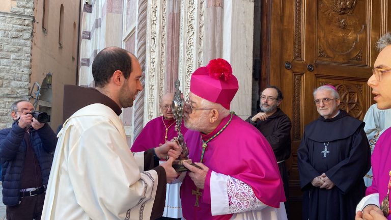 San Francesco è certamente una persona che ha fatto la verità, che è venuto verso la lue e noi siamo qui a testimoniare che le sue opere sono state fatte in Dio. Tanto sono state fatte in Dio, che il popolo cristiano – se volete anche in maniera esagerata – l’ha chiamato “L’altro Cristo”. Ho detto “esagerata” perché Cristo è uno solo e tutti, Francesco compreso, sono stati redenti. Ma quella luce era così splendente e bella, e grande che ha attirato e attira ancora dopo secoli la venerazione, la considerazione, la preghiera, la lode del popolo cristiano. Questo è il senso dell’accoglienza, questa sera, di una sua reliquia. Noi ricordiamo le stimmate di Francesco, evento così straordinario da aver impressionato i contemporanei; ora noi sappiamo, però, come ci dice Paolo, che ogni carisma è dato per l’utilità, il benessere, il vantaggio di tutto il popolo cristiano. Questo è il primo criterio: Dio dà un dono, ma esso deve essere condiviso, altrimenti va a male e diventa autoreferenziale perdendo il suo senso. Questo è uno dei criteri che la Chiesa usa quando si tratta di giudicare un’esperienza spirituale. Ne utilizza anche altri, di criteri, ma il primo è questo!