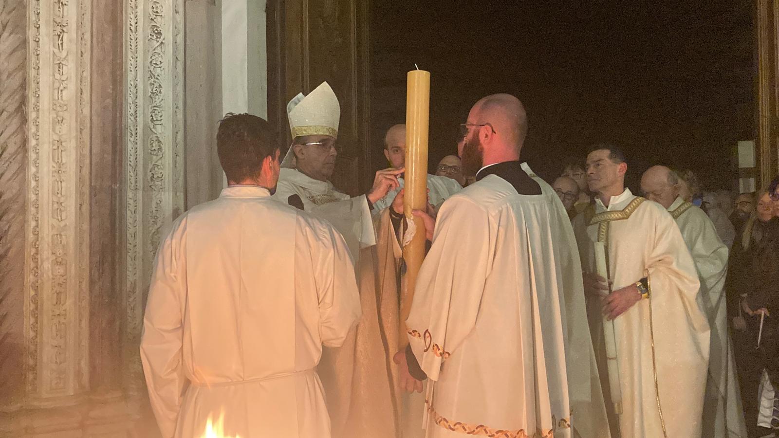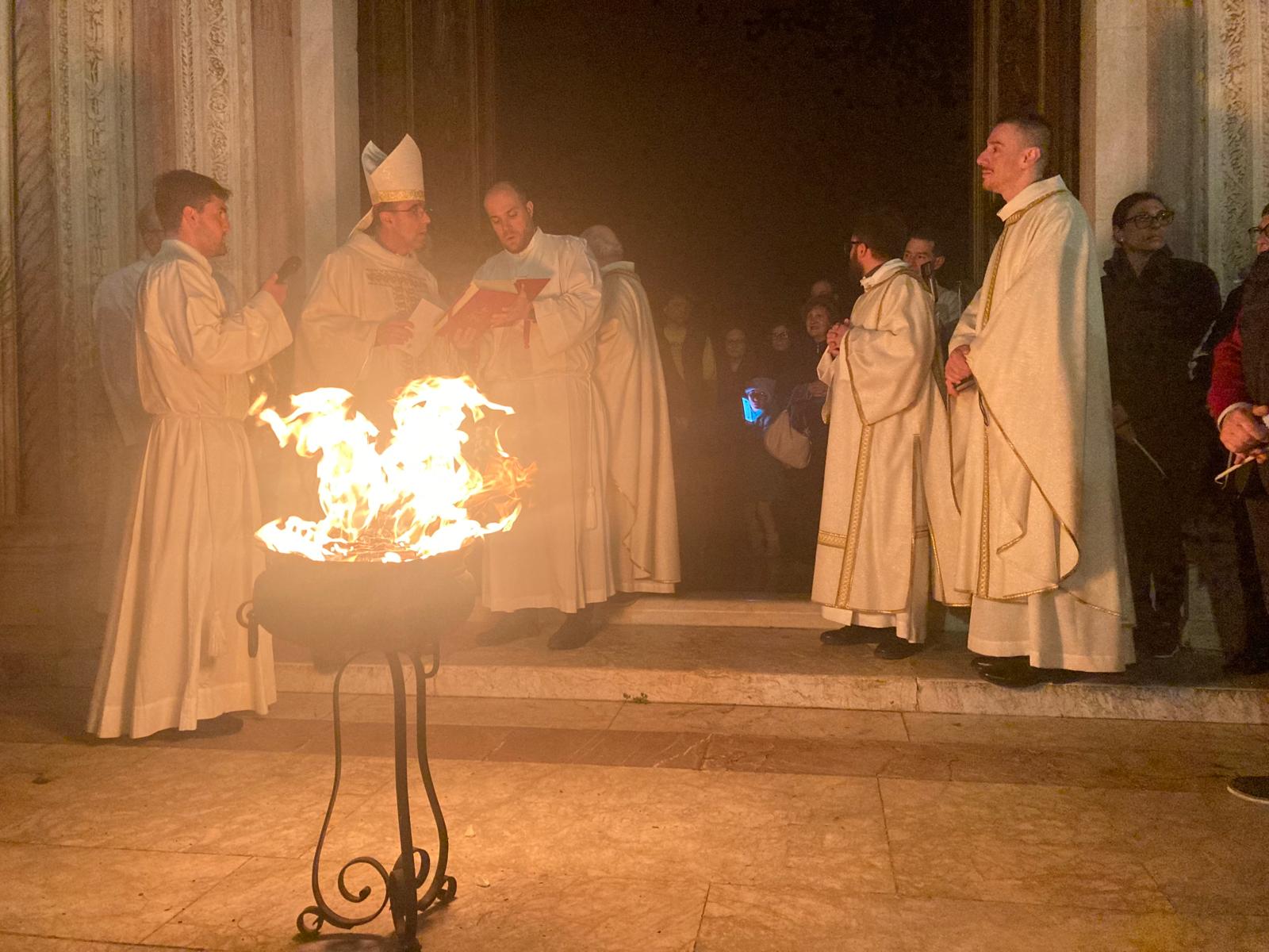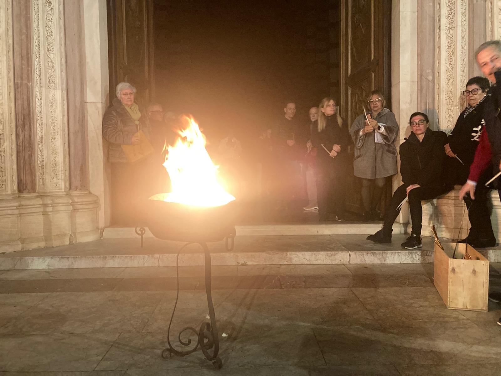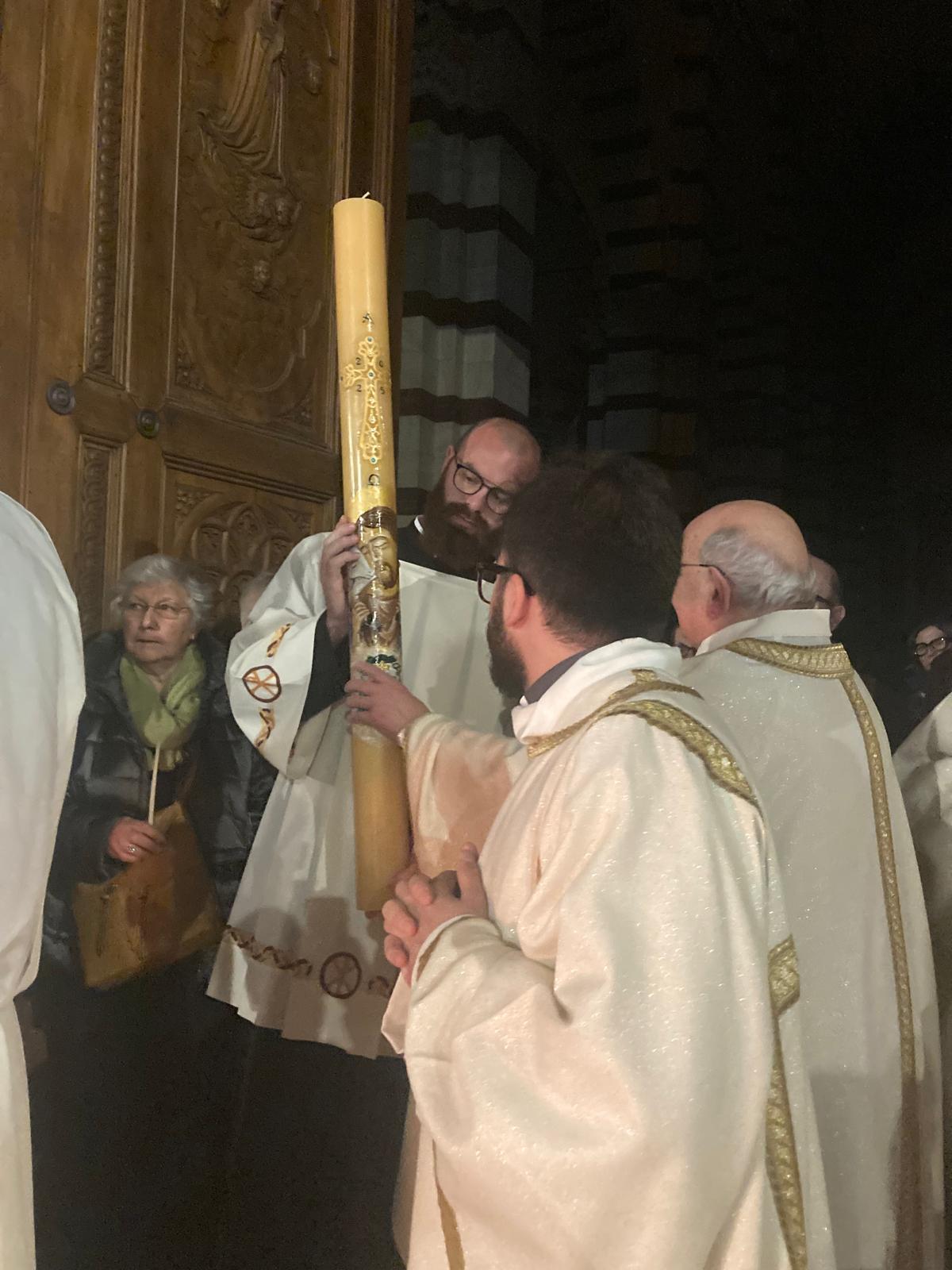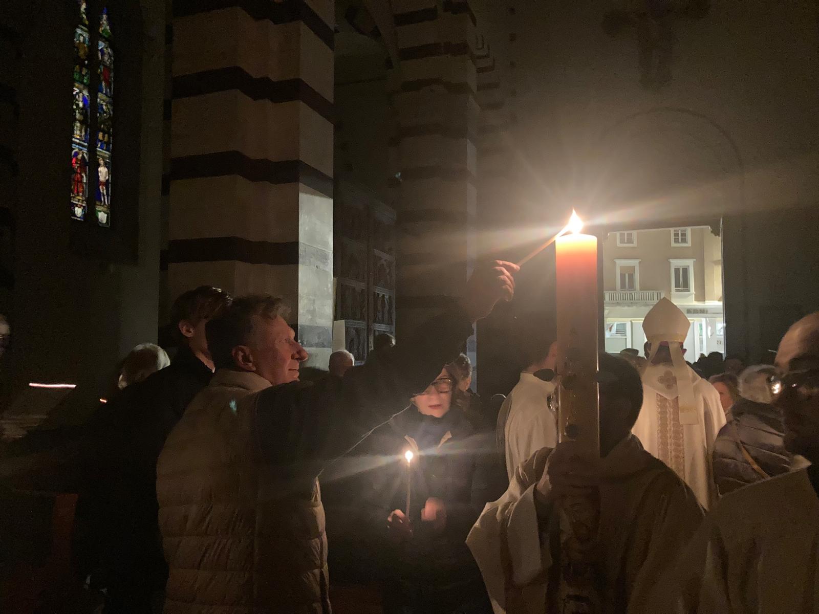 Fai Pasqua attraverso quella tua fragilità; fai Pasqua attraverso quella tua ambiguità. Se abbiamo il coraggio di consegnarla al Signore avremo anche il coraggio di vedere questo cero in modo diverso rispetto a quando siamo entrati in cattedrale al buio. La luce l’abbiamo presa tutti dalla stessa fonte: questo cero. E questo gesto ci dice che far passare l’esperienza della fede è importante, ma serve l’unica fonte, l’unico cero! Oggi invece abbiamo una difficoltà: la candela che ho – l’esperienza della mia fede – la tengo per me e non consegno la luce a qualcun altro. È mia e basta. No, l’esperienza della fede nel Risorto non è una gestione privata: va condivisa! E, caso strano: più tu condividi l’esperienza della fede, più aumenta in te! Sarebbe una bella sfida condividere ciò che io credo. “Ma sai che dire quella preghiera alla mattina, mi fa partire bene?” …”Ma sai che un passaggio in chiesa durante la giornata, mi mette pace?” Condividilo! Dillo a qualcun altro! Condividi cioè l’esperienza che vivi! Quanto e come le persone che hanno fatto Pasqua nella loro capacità di amare – perchè l’amore passa per la croce – sono le più credibili! Noi abbiamo imparato a voler bene dalle persone che hanno fatto Pasqua, perchè hanno parlato, ma anche vissuto cosa ha significato la tenebra, la disperazione, la risurrezione, la morte e la vita!