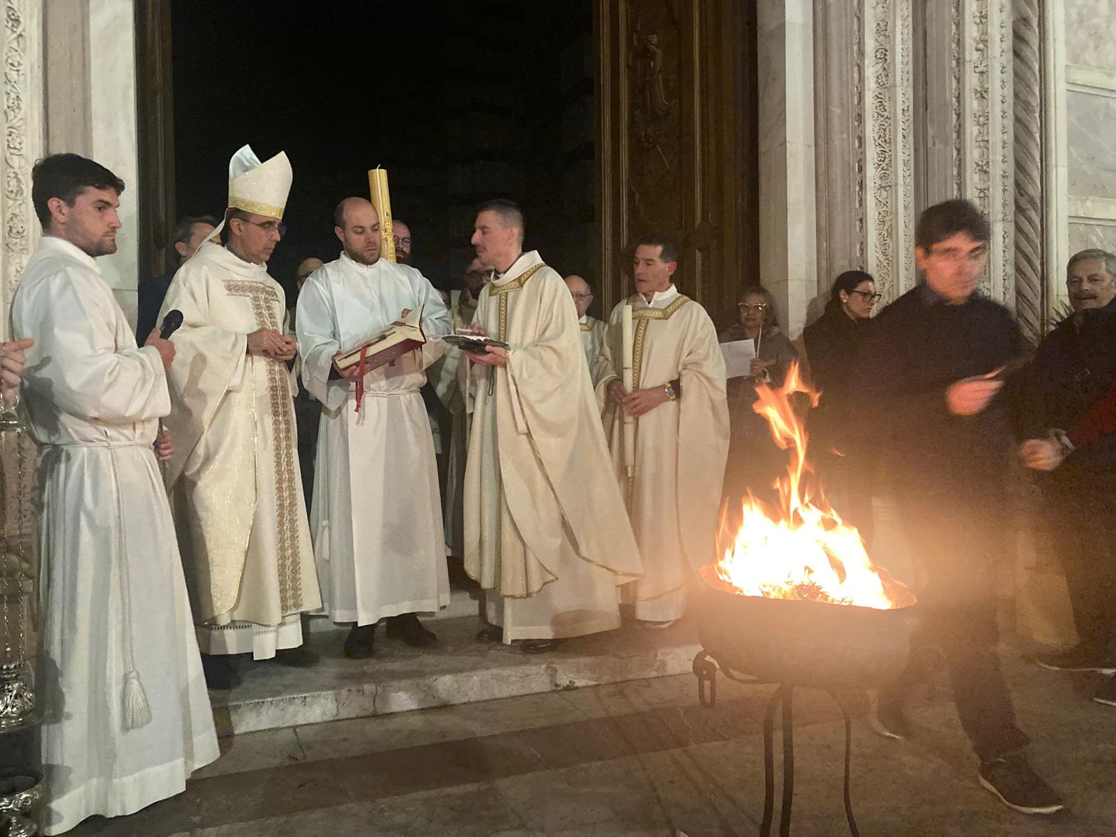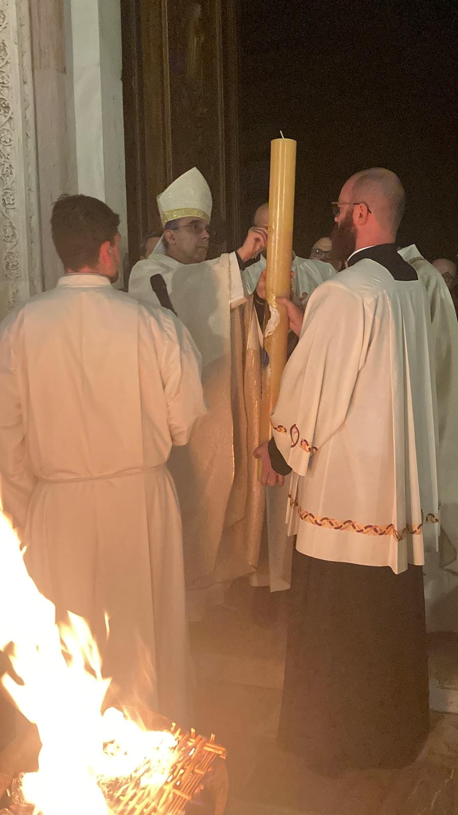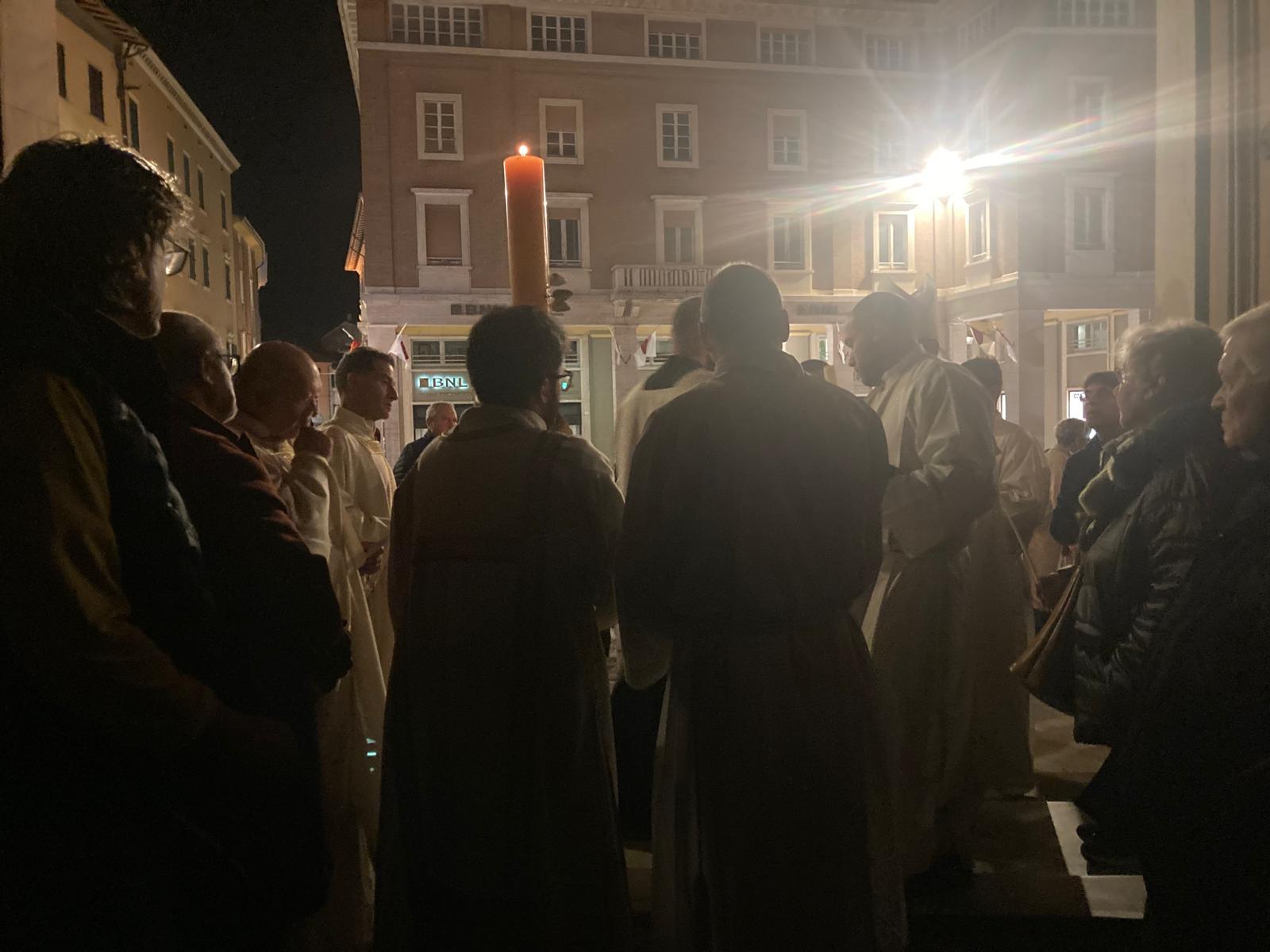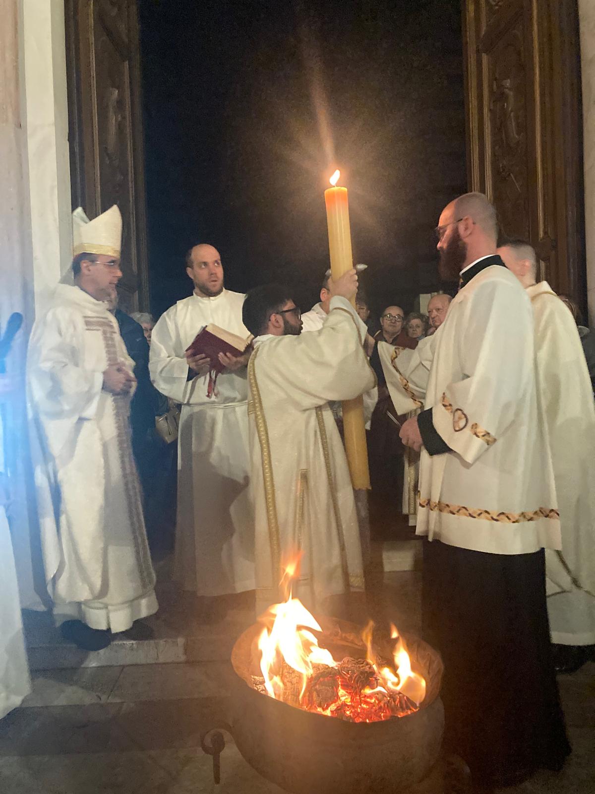Fai Pasqua attraverso quella tua fragilità; fai Pasqua attraverso quella tua ambiguità. Se abbiamo il coraggio di consegnarla al Signore avremo anche il coraggio di vedere questo cero in modo diverso rispetto a quando siamo entrati in cattedrale al buio. La luce l’abbiamo presa tutti dalla stessa fonte: questo cero. E questo gesto ci dice che far passare l’esperienza della fede è importante, ma serve l’unica fonte, l’unico cero! Oggi invece abbiamo una difficoltà: la candela che ho – l’esperienza della mia fede – la tengo per me e non consegno la luce a qualcun altro. È mia e basta. No, l’esperienza della fede nel Risorto non è una gestione privata: va condivisa! E, caso strano: più tu condividi l’esperienza della fede, più aumenta in te! Sarebbe una bella sfida condividere ciò che io credo. “Ma sai che dire quella preghiera alla mattina, mi fa partire bene?” …”Ma sai che un passaggio in chiesa durante la giornata, mi mette pace?” Condividilo! Dillo a qualcun altro! Condividi cioè l’esperienza che vivi! Quanto e come le persone che hanno fatto Pasqua nella loro capacità di amare – perchè l’amore passa per la croce – sono le più credibili! Noi abbiamo imparato a voler bene dalle persone che hanno fatto Pasqua, perchè hanno parlato, ma anche vissuto cosa ha significato la tenebra, la disperazione, la risurrezione, la morte e la vita!