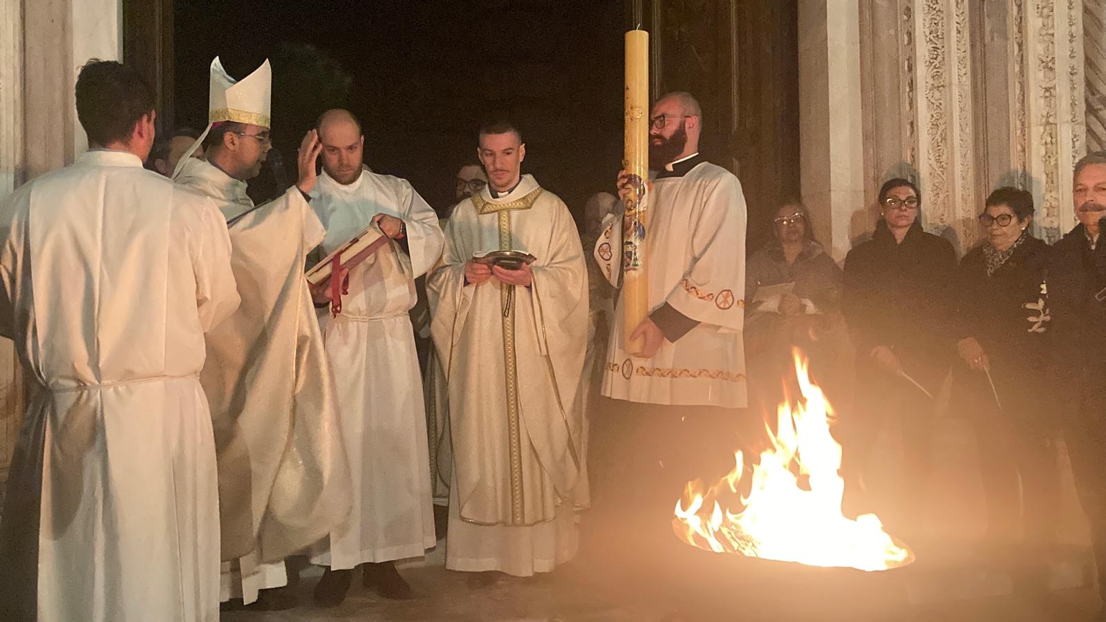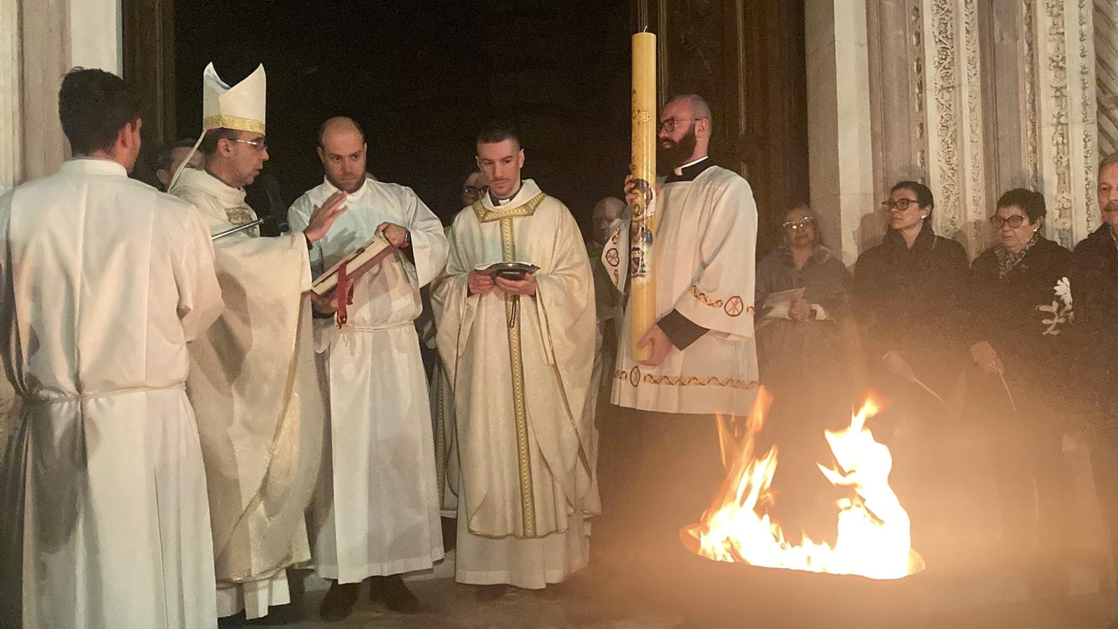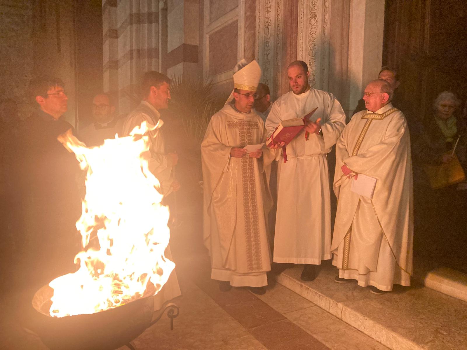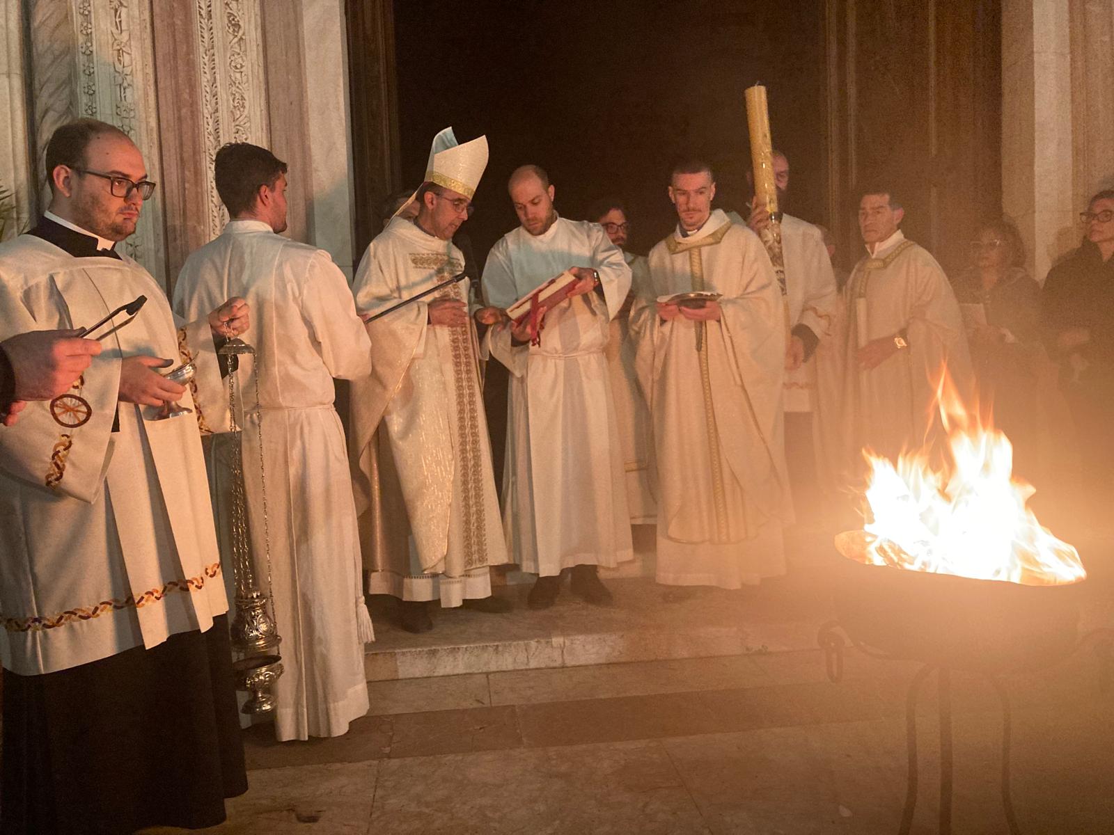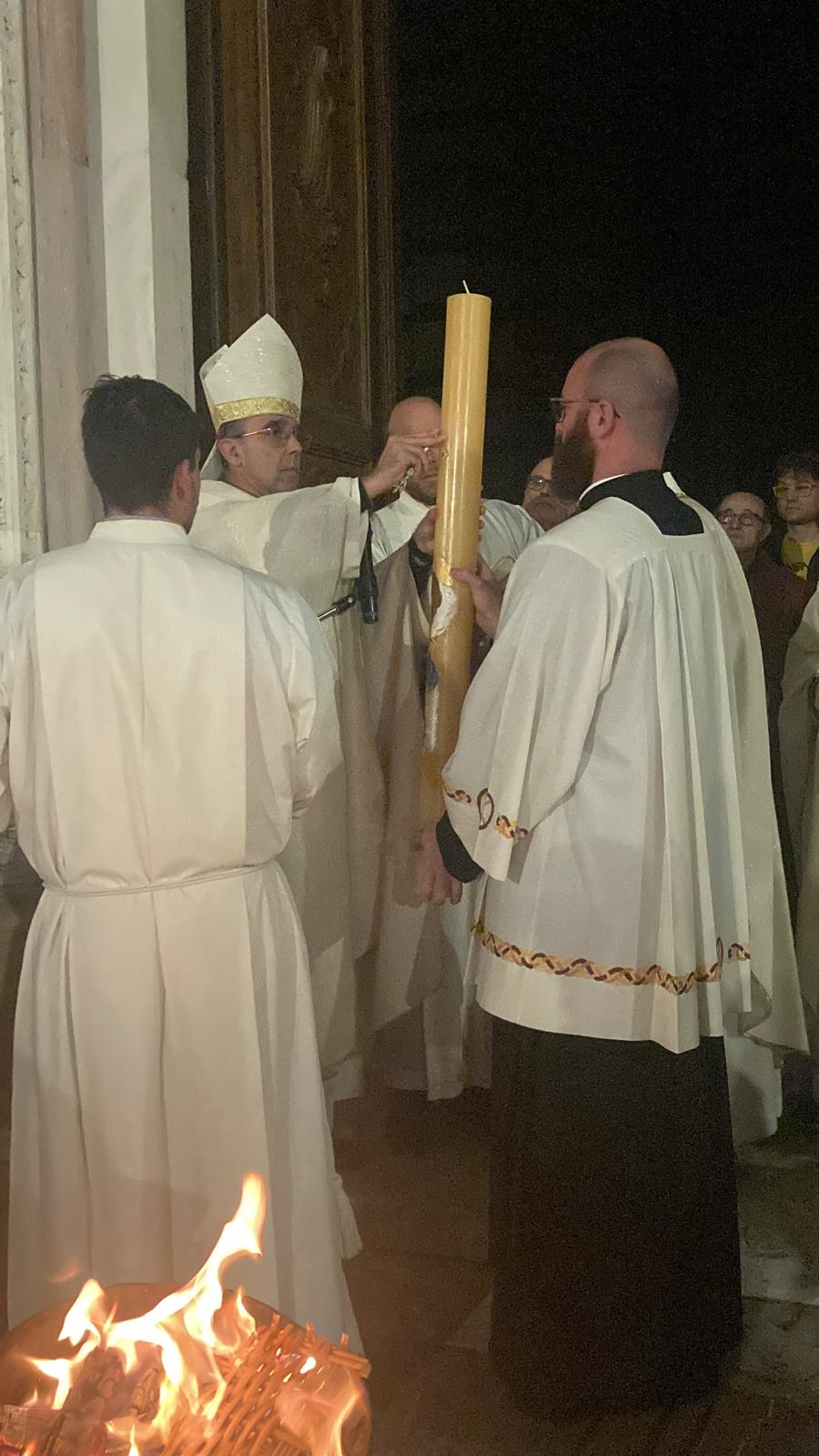 Fai Pasqua attraverso quella tua fragilità; fai Pasqua attraverso quella tua ambiguità. Se abbiamo il coraggio di consegnarla al Signore avremo anche il coraggio di vedere questo cero in modo diverso rispetto a quando siamo entrati in cattedrale al buio. La luce l’abbiamo presa tutti dalla stessa fonte: questo cero. E questo gesto ci dice che far passare l’esperienza della fede è importante, ma serve l’unica fonte, l’unico cero! Oggi invece abbiamo una difficoltà: la candela che ho – l’esperienza della mia fede – la tengo per me e non consegno la luce a qualcun altro. È mia e basta. No, l’esperienza della fede nel Risorto non è una gestione privata: va condivisa! E, caso strano: più tu condividi l’esperienza della fede, più aumenta in te! Sarebbe una bella sfida condividere ciò che io credo. “Ma sai che dire quella preghiera alla mattina, mi fa partire bene?” …”Ma sai che un passaggio in chiesa durante la giornata, mi mette pace?” Condividilo! Dillo a qualcun altro! Condividi cioè l’esperienza che vivi! Quanto e come le persone che hanno fatto Pasqua nella loro capacità di amare – perchè l’amore passa per la croce – sono le più credibili! Noi abbiamo imparato a voler bene dalle persone che hanno fatto Pasqua, perchè hanno parlato, ma anche vissuto cosa ha significato la tenebra, la disperazione, la risurrezione, la morte e la vita!