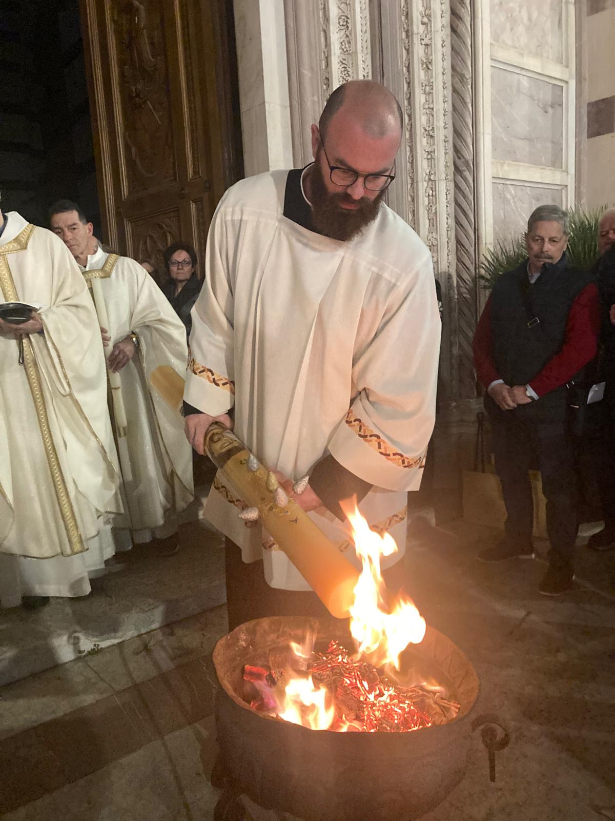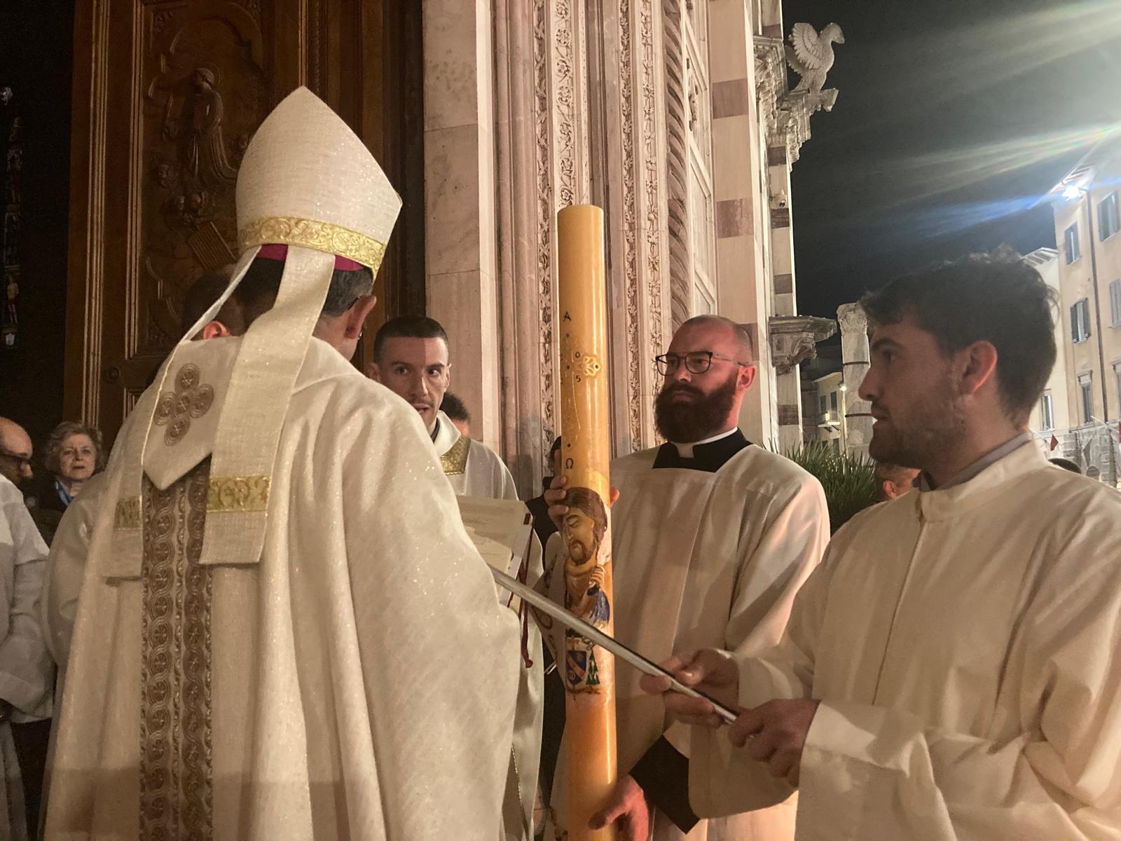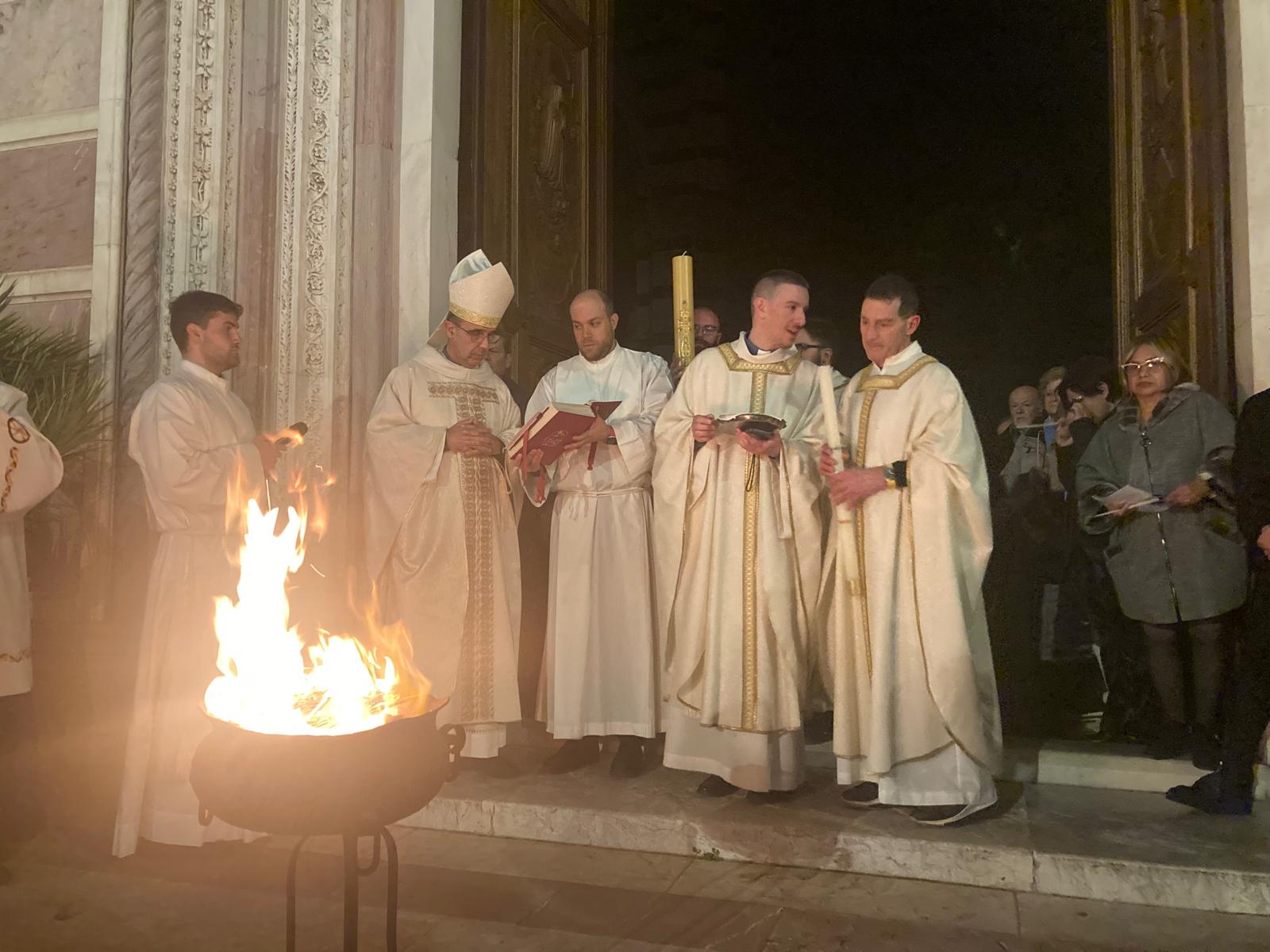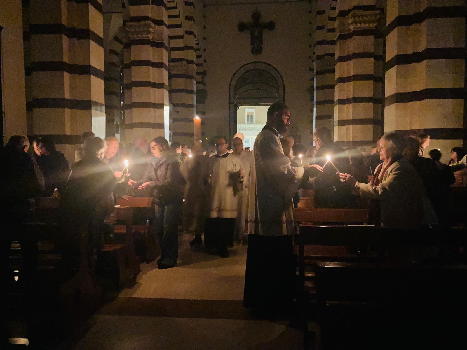 Fai Pasqua attraverso quella tua fragilità; fai Pasqua attraverso quella tua ambiguità. Se abbiamo il coraggio di consegnarla al Signore avremo anche il coraggio di vedere questo cero in modo diverso rispetto a quando siamo entrati in cattedrale al buio. La luce l’abbiamo presa tutti dalla stessa fonte: questo cero. E questo gesto ci dice che far passare l’esperienza della fede è importante, ma serve l’unica fonte, l’unico cero! Oggi invece abbiamo una difficoltà: la candela che ho – l’esperienza della mia fede – la tengo per me e non consegno la luce a qualcun altro. È mia e basta. No, l’esperienza della fede nel Risorto non è una gestione privata: va condivisa! E, caso strano: più tu condividi l’esperienza della fede, più aumenta in te! Sarebbe una bella sfida condividere ciò che io credo. “Ma sai che dire quella preghiera alla mattina, mi fa partire bene?” …”Ma sai che un passaggio in chiesa durante la giornata, mi mette pace?” Condividilo! Dillo a qualcun altro! Condividi cioè l’esperienza che vivi! Quanto e come le persone che hanno fatto Pasqua nella loro capacità di amare – perchè l’amore passa per la croce – sono le più credibili! Noi abbiamo imparato a voler bene dalle persone che hanno fatto Pasqua, perchè hanno parlato, ma anche vissuto cosa ha significato la tenebra, la disperazione, la risurrezione, la morte e la vita!