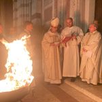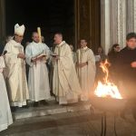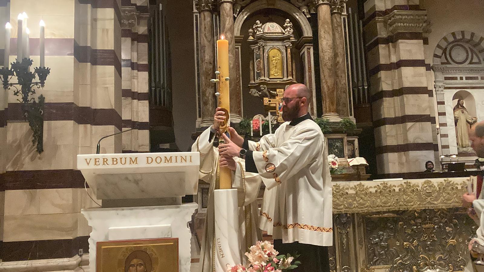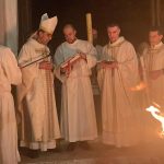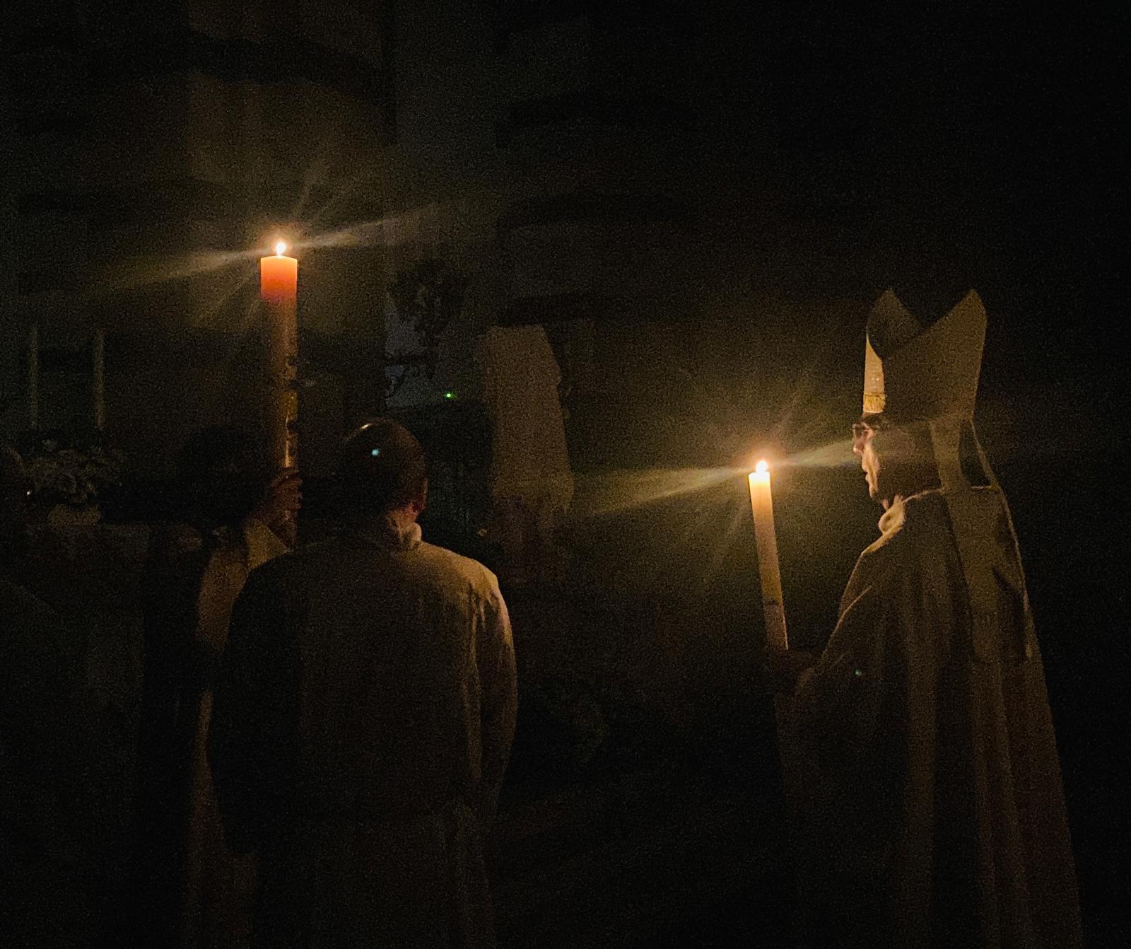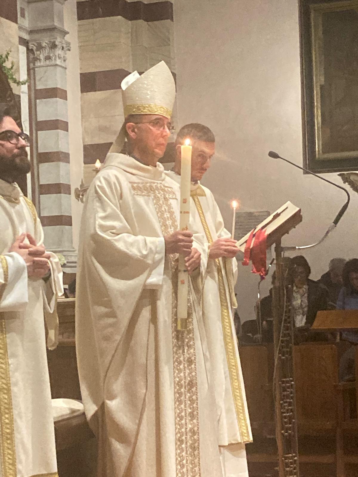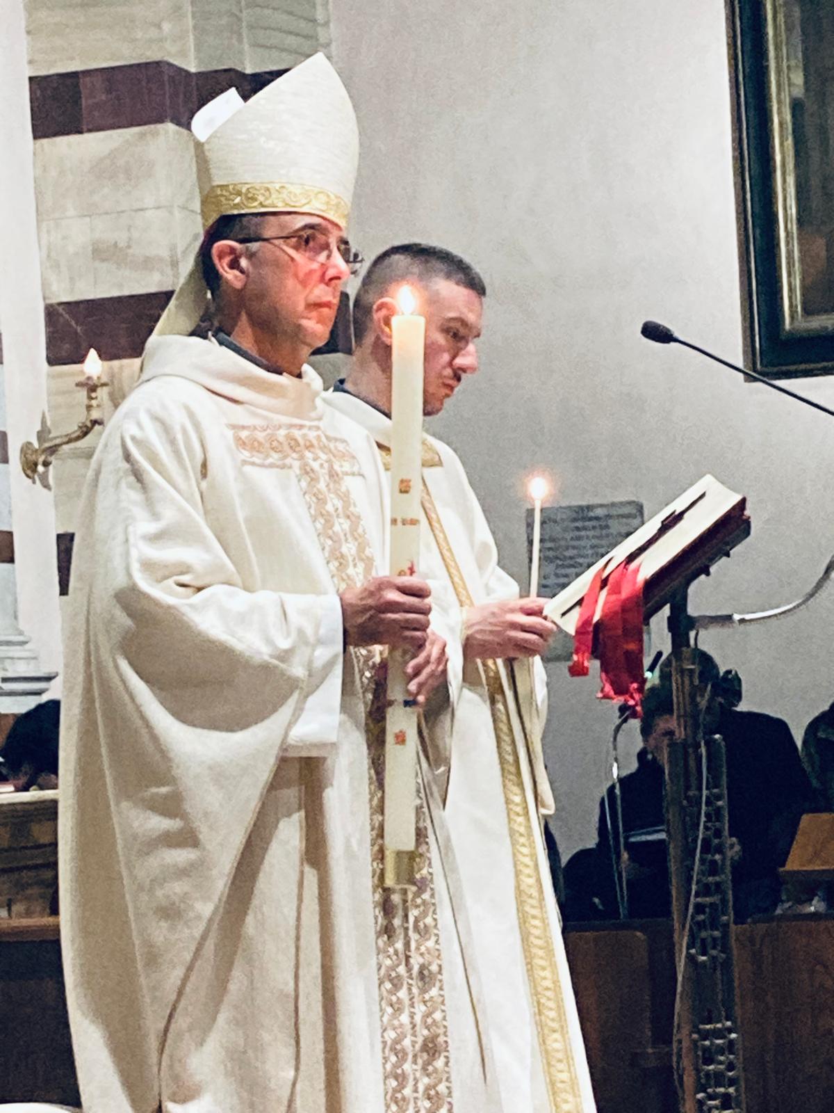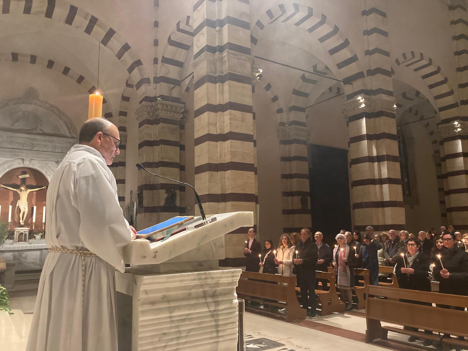 Fai Pasqua attraverso quella tua fragilità; fai Pasqua attraverso quella tua ambiguità. Se abbiamo il coraggio di consegnarla al Signore avremo anche il coraggio di vedere questo cero in modo diverso rispetto a quando siamo entrati in cattedrale al buio. La luce l’abbiamo presa tutti dalla stessa fonte: questo cero. E questo gesto ci dice che far passare l’esperienza della fede è importante, ma serve l’unica fonte, l’unico cero! Oggi invece abbiamo una difficoltà: la candela che ho – l’esperienza della mia fede – la tengo per me e non consegno la luce a qualcun altro. È mia e basta. No, l’esperienza della fede nel Risorto non è una gestione privata: va condivisa! E, caso strano: più tu condividi l’esperienza della fede, più aumenta in te! Sarebbe una bella sfida condividere ciò che io credo. “Ma sai che dire quella preghiera alla mattina, mi fa partire bene?” …”Ma sai che un passaggio in chiesa durante la giornata, mi mette pace?” Condividilo! Dillo a qualcun altro! Condividi cioè l’esperienza che vivi! Quanto e come le persone che hanno fatto Pasqua nella loro capacità di amare – perchè l’amore passa per la croce – sono le più credibili! Noi abbiamo imparato a voler bene dalle persone che hanno fatto Pasqua, perchè hanno parlato, ma anche vissuto cosa ha significato la tenebra, la disperazione, la risurrezione, la morte e la vita!